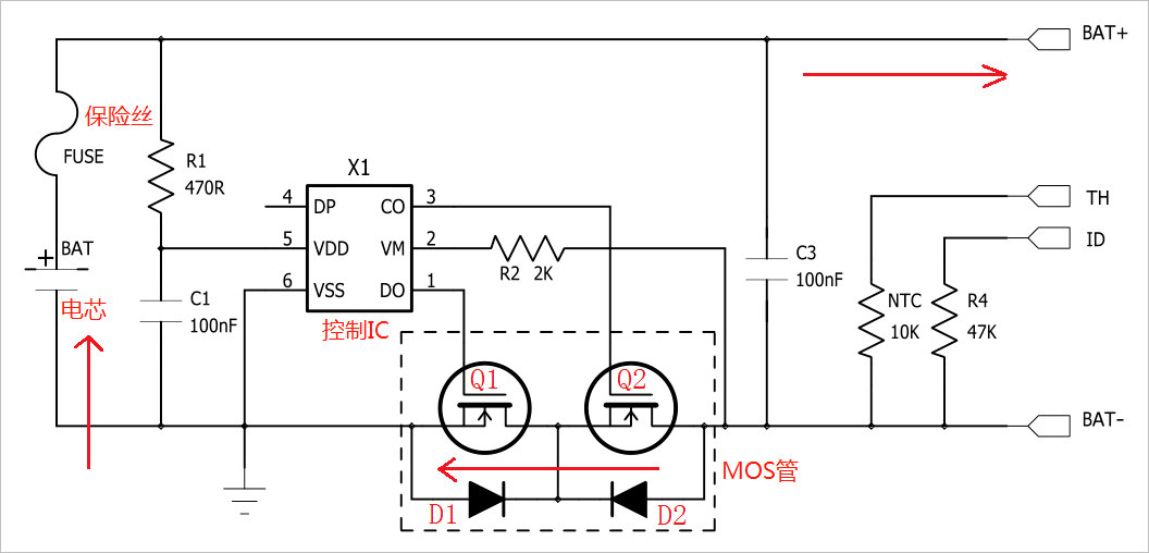 當(dāng)電池充電時(shí),電流從電池包的正極流入,經(jīng)過(guò)FUSE后從負(fù)極流出,最下方的兩個(gè)MOS管均是導(dǎo)通狀態(tài)。如下圖紅色箭頭所示方向: