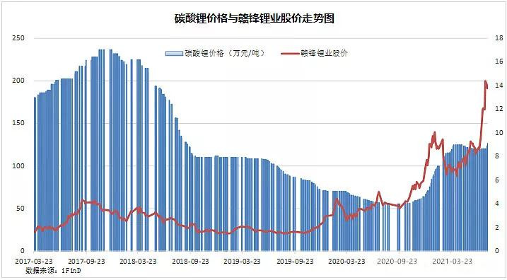 如上圖,碳酸鋰的價(jià)格從去年年中的4萬出頭每噸的價(jià)格,到了現(xiàn)在9萬,翻了一倍,但離2017年鋰價(jià)高峰期時(shí)14萬元每噸的價(jià)格還有相當(dāng)?shù)木嚯x。與之相對(duì)應(yīng)的是,龍頭贛鋒鋰業(yè)的股價(jià),卻早就超越2017年的高點(diǎn),不斷勇創(chuàng)新高了。