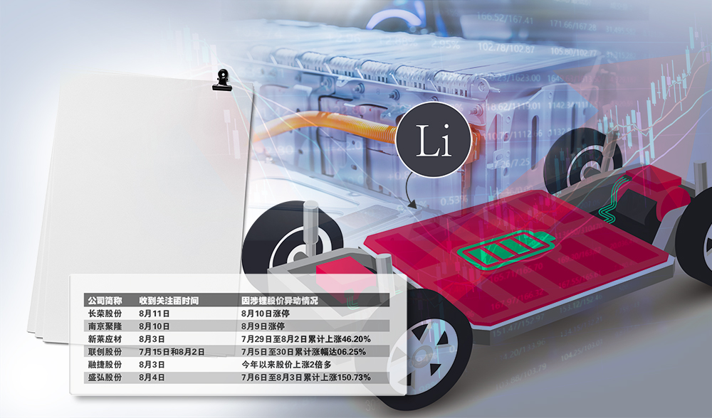 記者梳理發(fā)現(xiàn),進(jìn)入8月份以來,交易所至少對8家涉鋰或儲能的上市公司發(fā)出關(guān)注函,除上述2家公司外,還有鞍重股份、新萊應(yīng)材、聯(lián)創(chuàng)股份、贛鋒鋰業(yè)、融捷股份、盛弘股份等公司,它們均被要求就相關(guān)情況進(jìn)行進(jìn)一步披露,核實是否主動炒作股價等。