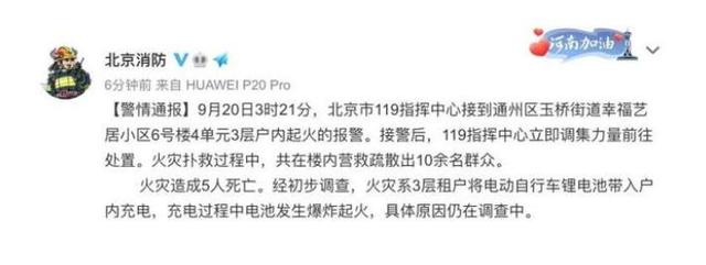 9月20日凌晨3時許,北京通州一小區火災致5人亡,起因為電動自行車