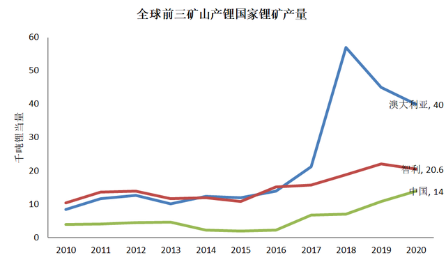 事實上,從全球范圍來看,我國的鋰資源并不突出。據BP能源統計,2020年全球礦山產鋰的第一大國為澳大利亞,2020年產量為40千噸鋰當量,其次為智利,2020年產量為20.6千噸鋰當量,中國位列第三位,為14千噸鋰當量。