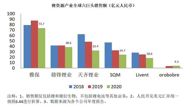 據相關上市公司披露數據,全球前六大鋰資源公司分別為雅保、贛鋒鋰業、天齊鋰業、SQM、Livent和orobore。這六家公司2020年度分別在鋰礦及鋰衍生物領域銷售額達到73.7億元、38.6億元、32.4億元、24.7億元、18.6億元和4.3億元(人民幣,人民幣兌美元匯率以6.44進行折算)。