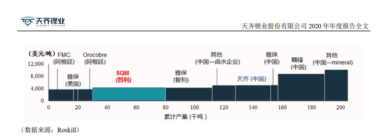 據天齊鋰業在2020年報中轉引Roskill的研究,全球各主要鋰化工產品生產企業的碳酸鋰提鋰成本排名較前的受FMC(即Livent)、雅保和SQM這些海外企業控制,而天齊鋰業和贛鋒鋰業所控制的鋰資源開采成本都排名較為靠后。