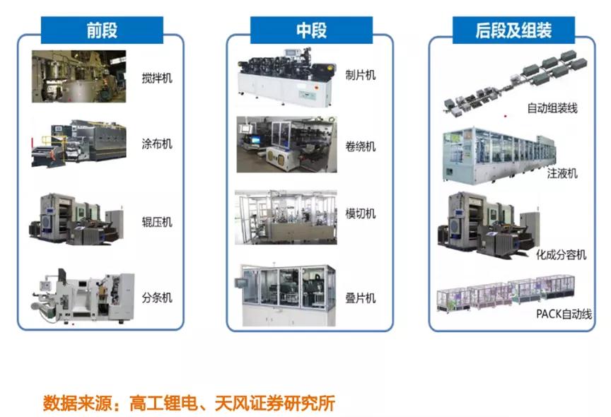 在制作電池的過程中,根據制造先后順序,可以分為前段、中段、后段三個環節。這三個環節的設備所含價值量大體相等。