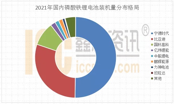 據(jù)新能源汽車裝機量及上險數(shù)據(jù)顯示,2021年1-12月國內動力電池裝機量達到154.5Gwh,同比增長142.8%,其中磷酸鐵鋰電池在7月實現(xiàn)對三元電池產(chǎn)量與裝機量的雙重超越后,領先優(yōu)勢不斷擴大,1-12月累計裝機量達到79.8Gwh,占比51.7%,同比增幅達到227.4%,其中寧德時代、比亞迪和國軒高科分列磷酸鐵鋰電池裝機前三甲,CR3集中度超過85%。