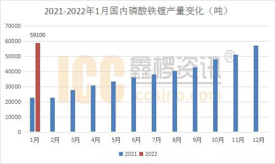 在過去的2021年,磷酸鐵鋰憑借高性價比優(yōu)勢成為市場選擇的寵兒,主流材料生產(chǎn)企業(yè)大多實現(xiàn)扭虧為盈,而下游動力方面需求的強勁支撐也使其在年末階段面對高價的碳酸鋰原料依然積極掃貨。據(jù)ICC鑫欏資訊統(tǒng)計數(shù)據(jù)顯示,2022年1月國內磷酸鐵鋰產(chǎn)量為5.91萬噸,同比增長158.9%,環(huán)比小幅提升3.3%。