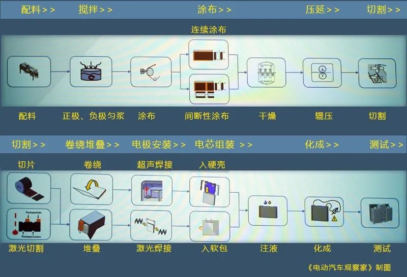 無論是哪種電池,生產(chǎn)工藝流程大致類似,分為勻漿、涂布、輥壓、切片、疊片(或卷繞)、裝配、注液、化成等。