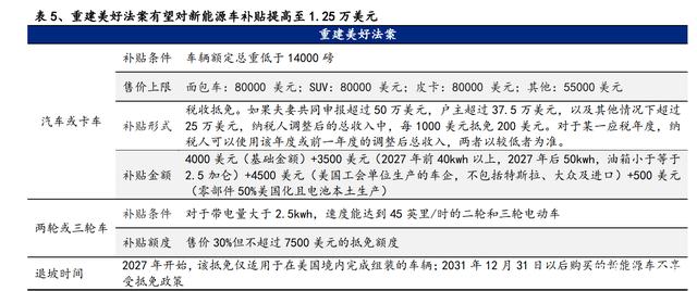 美國多舉措并行,補貼政策加大支持力度,新能源補貼金額上限由 7500 美元提 高至 1.25 萬美元。美國現行的補貼政策于 2009 年通過,2010 年開始實行。在聯 邦層面,根據電池容量的不同,補貼額度在 2500 美元-7500 美元,補貼形式為稅 收抵免,即消費者可在額度內抵扣當年應繳納的聯邦稅,在現行政策下銷量達到 20 萬輛將觸發的退坡機制。而根據最新通過的議案,美國有望將對新能源車的補 貼上限提至 1.25 萬美元。在眾議院通過的重建美好法案(Build Back Better Act) 中,補貼提升為 4000 美元(基礎金額)+3500 美元(2027 年前 40KWh 以上,2027 年后 50KWh)+4500 美元(美國工會單位生產的車企,不包括特斯拉、大眾及進口) +500 美元(零部件 50%美國化且電池本土生產),同時提案取消了 20 萬輛的補貼 上限限制。2021 年 11 月 16 日,美國總統拜登簽署 1.2 萬億美元基建計劃,其中 75 億美元用于包括充電站在內的電動車基礎建設。