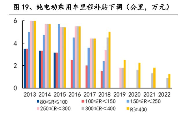 以特斯拉 model 3 為例,2020 年交付的標準續航升級版(磷酸鐵鋰版本)續航里 程為 468 公里,里程補貼標準 22500 元,能量密度調整系數 0.9,車輛耗能調整 系數 1.1,實際補貼金額為 19800 元。2021 年,里程補貼標準退坡 20%,能量密 度與能耗調整系數不變,實際補貼金額為 15840 元;2022 年補貼繼續退坡 30%, 補貼金額降為 11088 元,國補退坡金額達 4752 元。受此影響,2021 年 11 月 24 日,Model 3 補貼后售價從 250900 元上漲 4752 元至 255652 元,2022 年 1 月 1 日再次上調 10000 元,當前補貼后起售價為 265652 元。