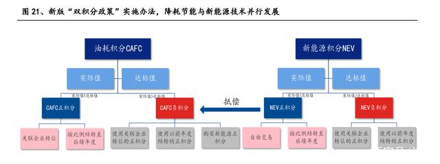 接力補貼政策,雙積分政策出臺。為了確保補貼政策退出之后,新能源汽車扶持力度不會斷檔,同時加快傳統燃油車的技術升級,2017 年 9 月工信部等五個部門 聯合發布了《乘用車企業平均燃料消耗量與新能源汽車積分并行管理辦法》,即“雙 積分政策”,對乘用車企業設立油耗積分(CAFC)和新能源積分(NEV)兩個考核 指標,鼓勵車企發展新能源技術的同時兼顧傳統燃油車的節能減排。CAFC=(達標 值-實際值)×年度生產/進口總量,NEV =達標值-實際值,當實際值低于達標值 時產生正積分,高于達標值時產生負積分。其中,CAFC 正積分只能自行結轉或轉 讓給關聯企業,不能用于 NEV 負積分的抵償,而 NEV 正積分則可以自由交易,可 抵償 NEV 負積分和 CAFC 負積分。最終核算時不同車型的積分相加結果必須為正, 若產生 CAFC 負積分,則需向其他正積分企業購買 CAFC 正積分或 NEV 正積分,若 產生 NEV 負積分,則只能向其他正積分企業購買 NEV 正積分。