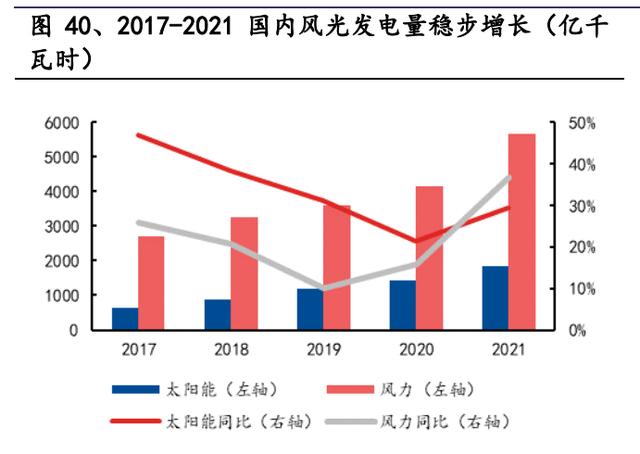 風光發電量持續提升,多項政策加強新型儲能推廣應用。受益于政策推動和硬成 本的下降,國內可再生能源的發電量和滲透率逐步提升,2021 年光伏發電量和風 力發電量分別為 1836.6 億千瓦時和 5667 億千瓦時,同比增長 29.2%和 36.7%,合 計占比從 2017 年的 5.33%提升至 2021 年 9.29%。由于風光發電存在固有的間歇性 和波動性,其規模化發展勢必要求儲能行業對應發展以平抑供需矛盾。2021 年 5 月,國家能源局發布《關于 2021 年風電、光伏發電開發建設有關事項的通知》, 指出配套儲能設施為風電、光伏發電項目市場化并網條件之一;同月,國家發改 委印發《關于“十四五”時期深化價格機制改革行動方案的通知》,指出要深入推 進能源價格改革,完善風電、光伏發電、抽水蓄能價格形成機制,建立新型儲能 價格機制。