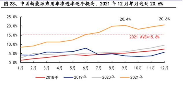 中國新能源汽車市場規模不斷擴大,滲透率穩步上升,2022 年新能源汽車滲透率 將達 22%。得益于中國新能源補貼政策,中國新能源汽車滲透率不斷提高, 2018/2019/2020/2021 滲透率分別為 4.4%/5.0%/6.0%/15.6%,2021 年 12 月單月 滲透率達 20.6%,乘聯會預測 2022 年滲透率將達到 22%。2021 年全年新能源車銷 量達到 350 萬輛,同比增加 165%,其中乘用車 332 萬輛,同比增加 176%,12 月 單月新能源車銷量 53.1 萬輛,同比增加 114%,其中乘用車 49.8 萬輛,同比增加 121%。除政策之外,中國新能源汽車銷量和滲透率的不斷提高還得益于基礎設施 建設加快,新產品不斷優化迭代等多方面因素。