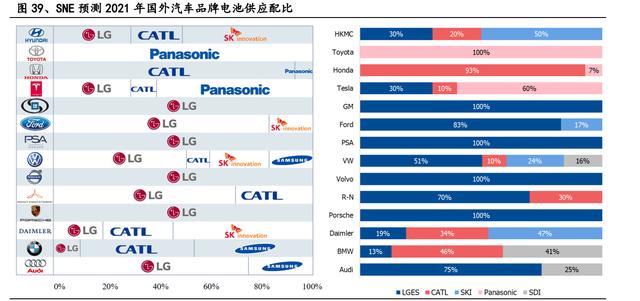 公司與國內一線車企合資建廠,深度綁定造車新勢力,同時切入海外主機廠的供 應鏈,形成優質多元的客戶結構。2016 年起,寧德時代陸續與北京汽車、長安汽 車、長城汽車等國內整車廠簽訂戰略合作協議,保持長期深入的合作伙伴關系。 2017 年起,先后與上汽集團、東風汽車、廣汽集團、吉利汽車和一汽集團共同出 資設立合資公司共 7 家,直接供應對應整車廠,增加與穩定公司的市場份額與地 位。2018 年,以“蔚小理”為代表的國內造車新勢力開始交付,公司作為配套車 型最多的主流動力電池廠商,順利成為這三家整車廠的主力供應商。其中,2021 年蔚來汽車和理想汽車由寧德時代獨供,對小鵬汽車的供應占比超 80%,隨著產 銷量的大幅提升,2022 年預計公司對蔚來,小鵬,理想均可實現翻倍供應。海外 客戶方面,2012 年,公司成為華晨寶馬首款 EV“之諾 1E”的動力電池供應商, 打響了進軍國際市場的第一槍,2018 年獲得寶馬集團、戴姆勒、現代起亞等多家 海外主機廠的定點信,境外業務取得實質性進展,2020 年公司與特斯拉簽署動力 電池框架協議,2021 年特斯拉超越蔚來成為公司第一大客戶,而公司也正式取代 LGES,成為特斯拉第一大動力電池供應商。隨著配套車型的陸續上市與放量,公 司的全球化布局將更進一步。