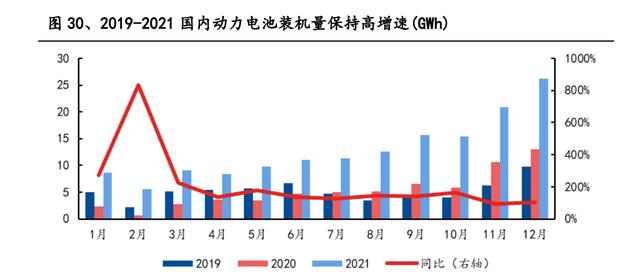伴隨國內新能源汽車迎來爆發式增長,2021 年國內動力電池裝機量同比增長 142.9%。2021 年隨著新能源汽車市場的全面爆發,國內動力電池裝車量實現翻倍 增長,全年裝機 154.5GWh,同比高增 142.9%。