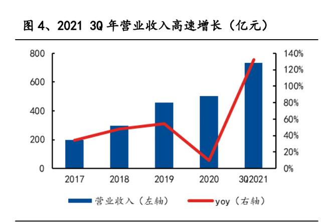 公司營收與歸母凈利潤同步高增。2017-2020 年,公司連續四年登頂全球動力電 池出貨量榜首,龍頭地位持續鞏固。2021 年前三季度公司實現營收 733.62 億元, 同比增長 132.7%,實現歸母凈利潤 77.51 億元,同比增長 130.9%,在低基數效應 和下游需求高增的雙重推動下,營收凈利增速雙創近五年同期新高。2021 年全年 公司預計實現凈利潤 140-165 億元,同比高增 181.38%-228.28%。
