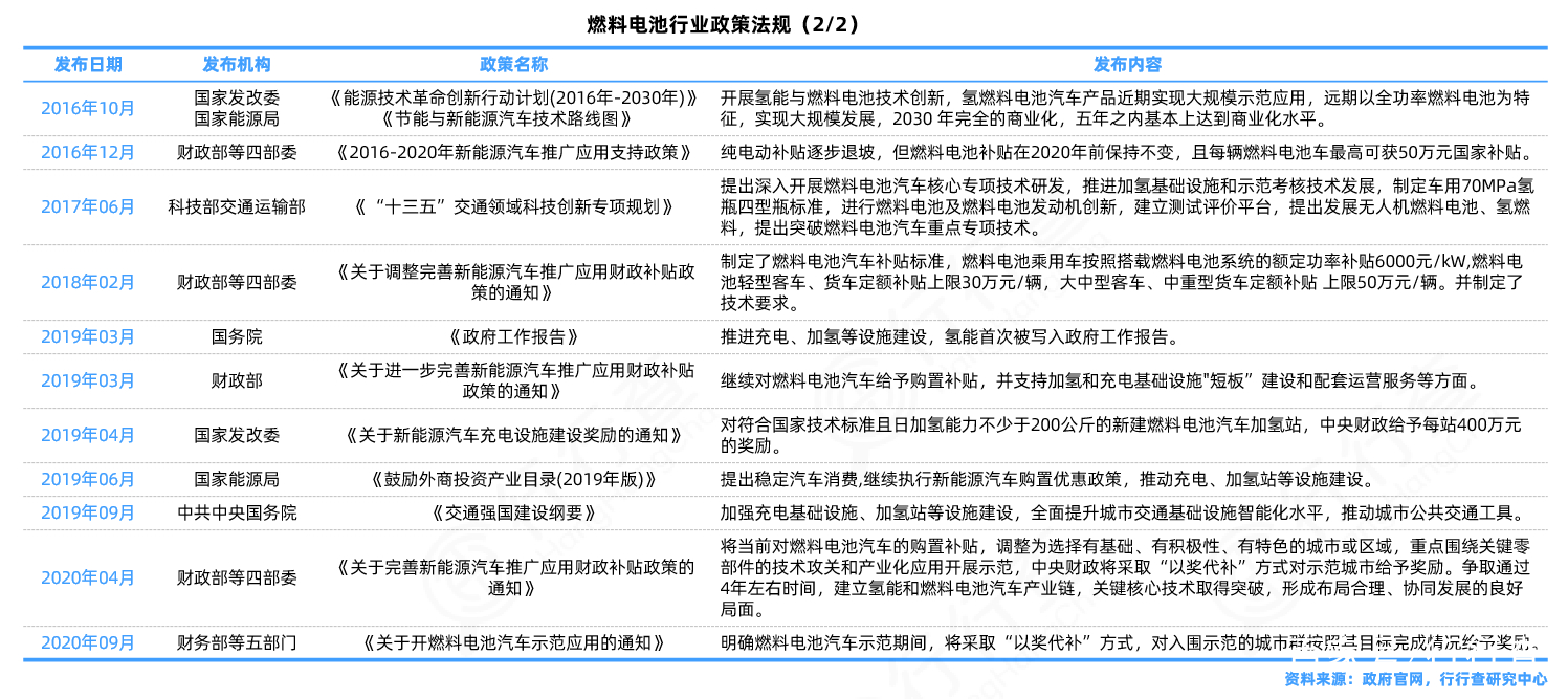 自2006年以來,我國在多項(xiàng)能源發(fā)展相關(guān)政策中提到氫能與燃料電池技術(shù)的推進(jìn),同時,目前我國已國民經(jīng)濟(jì)和社會發(fā)展計劃的主要任務(wù)中提出要制定國家氫能產(chǎn)業(yè)發(fā)展戰(zhàn)略規(guī)劃,隨著國家及地方產(chǎn)業(yè)政策的逐步實(shí)施、我國氫燃料電池核心技術(shù)的逐步突破積累、相關(guān)配套產(chǎn)業(yè)的逐步完善,氫燃料電池行業(yè)未來將有廣闊的發(fā)展空間。