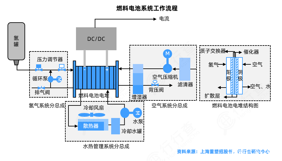 燃料電池系統(tǒng)使用供氫系統(tǒng)提供的氫氣進(jìn)行電化學(xué)反應(yīng),經(jīng)過DC/DC轉(zhuǎn)換輸出,以輸出滿足下游應(yīng)用場景中不同電機(jī)工作電壓要求的電流。燃料電池的電化學(xué)反應(yīng),消耗氫氣與氧氣,將氫氣中蘊(yùn)含的化學(xué)能轉(zhuǎn)化為電能,反應(yīng)過程不涉及燃燒,反應(yīng)產(chǎn)物為電、熱和水。燃料電池系統(tǒng)主要由燃料電池電堆、空氣/氫氣供給系統(tǒng)、水熱管理系統(tǒng)、DC/DC這五大系統(tǒng)構(gòu)成。燃料電池電堆可以通過電化學(xué)反應(yīng)輸出電流;空氣/氫氣供給系統(tǒng)是為電堆供應(yīng)合適壓力、純度、濕度的氫氣與空氣;水熱管理系統(tǒng)用于傳遞電化學(xué)反應(yīng)產(chǎn)生的熱量,保持燃料電池內(nèi)部水平衡和熱平衡;DC/DC變換器用于實(shí)現(xiàn)燃料電池與整車高壓之間解耦。