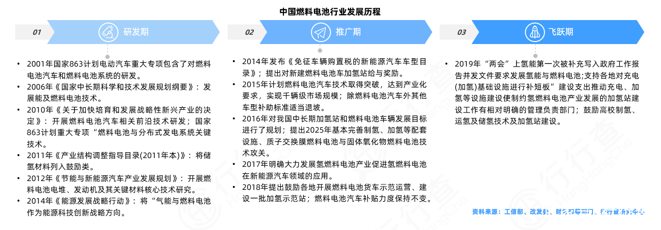 我國氫燃料電池起步較晚,2001年國家863計劃“電動汽車”重大科技專項(xiàng)即已確立了以混合動力汽車、純電動汽車、燃料電池汽車為“三縱”,以多能源動力總成控制系統(tǒng)、驅(qū)動電機(jī)和動力電池為“三橫”的電動汽車“三縱三橫”研發(fā)布局,并持續(xù)全面組織啟動大規(guī)模電動汽車技術(shù)研發(fā),其中包含了對燃料電池汽車和燃料電池系統(tǒng)的研發(fā)。隨后國家相關(guān)部門出臺了一系列政策及研發(fā)計劃,促進(jìn)氫燃料電池的研發(fā)進(jìn)步,其內(nèi)容涵蓋了制氫、儲氫、燃料電池部件以及電堆與系統(tǒng),氫燃料電池車等一系列課題,促進(jìn)了整個產(chǎn)業(yè)鏈的發(fā)展與進(jìn)步。