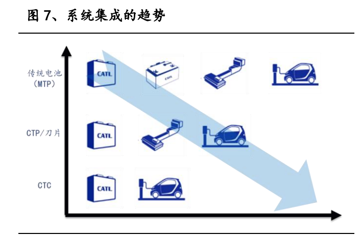 CTC 是未來電池整車匹配的必然趨勢。從特斯拉 Model S 的小模組,到 Model 3 的大模組,再到 4680 推出的 CTC 方案,模組的概念逐漸弱化和取消,電池包的集 成效率不斷提高。特斯拉電池系統(tǒng)不斷迭代,電池 BOM 成本降低,電池系統(tǒng)生產(chǎn) 效率和電池的體積利用率提高,成為降低電池成本和提高能量密度的有效路徑。 國外車企電池系統(tǒng)集成向 CTC 和 CTP 傾斜,特斯拉將在下一代 Model Y 使用 CTC, 現(xiàn)代汽車旗下的摩比斯與寧德時代簽訂了 CTP 的深度合作協(xié)議,沃爾沃將在第三 代電池系統(tǒng)集成方案采用 CTC。