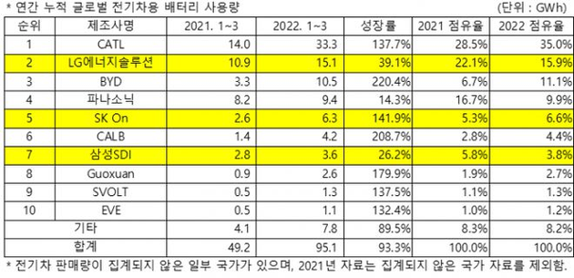相較去年,中國動力電池廠商們均實現(xiàn)了裝機量同比大幅增長,擠占了韓日廠商LG新能源(第二)、松下(第四)、SK On(第五)、三星SDI(第七)的市場占有率。