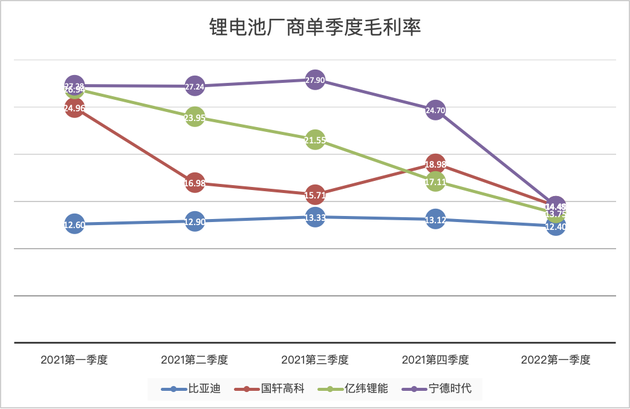 今年一季度,寧德時代、比亞迪、國軒高科、億緯鋰能等國內頭部動力電池廠商,毛利率均徘徊在14%上下。去年同期,除主營業(yè)務為整車的比亞迪外,其余三家動力電池廠商的毛利率都在26%上下。