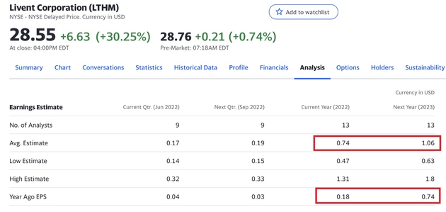 根據Yahoo財經數(shù)據,機構對于Livent 2022年、2023年的EPS預測均值分別為0.74、1.06,對應的同比增長率分別為311.11%、43.24%;機構預測雅保的EPS在2022年、2023年的同比增長率分別為53.96%、41.00%。