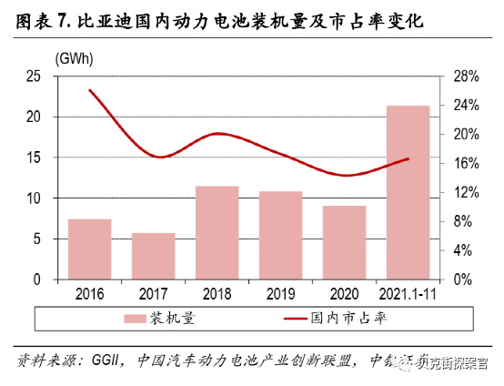 比如此次比亞迪電動車召回事件,雖然公司免費為問題車輛更換電池包的處理方式很有誠意,但也會進一步降低電池業(yè)務(wù)盈利能力,而且從公司動力電池裝機量國內(nèi)市占率來看,比亞迪2016年至2021年前11個月市占率波動較大,也間接證明該業(yè)務(wù)模塊抗風(fēng)險能力較低。