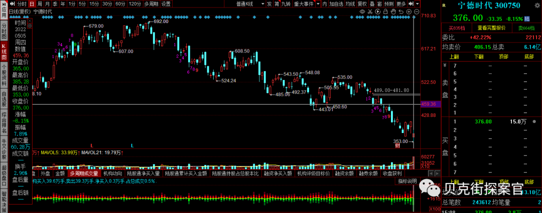 體現(xiàn)在二級市場,寧德時代股價幾近腰斬,從2021年12月687元每股的高價,跌至5月5日收盤的376元每股,跌幅超45%。