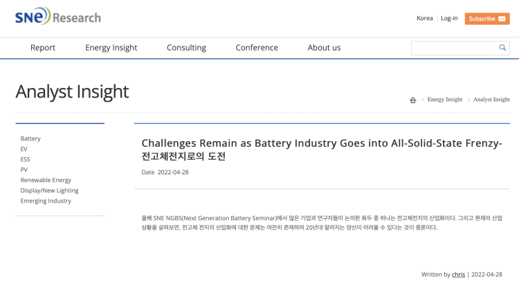即便是站在風口上,固態電池的實際情況可能并沒那么樂觀。近日,專注新能源、電動汽車等領域的韓國研究機構SNE發表了一篇文章,也給固態電池的量產落地潑了一盆冷水。