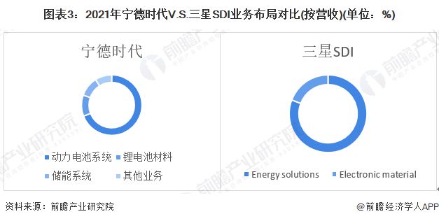 寧德時代主營業務圍繞鋰電池布局,是全球領先的動力電池企業。包括動力電池系統、儲能系統、鋰電池材料和其他業務。2021年動力電池系統營收占比最高,為69%;三星SDI的業務布局除了新能源之外,還包括電子材料,2021年新能源業務占比較高,為81%。