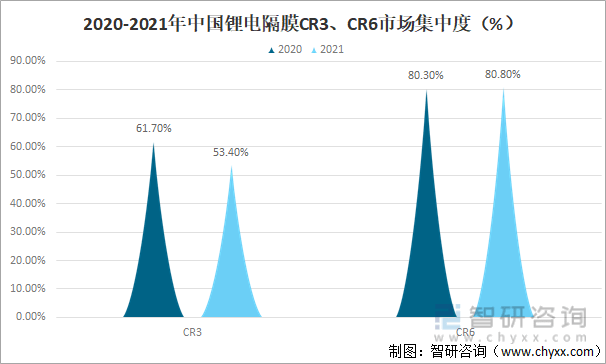 2020-2021年中國鋰電隔膜CR3、CR6市場集中度
