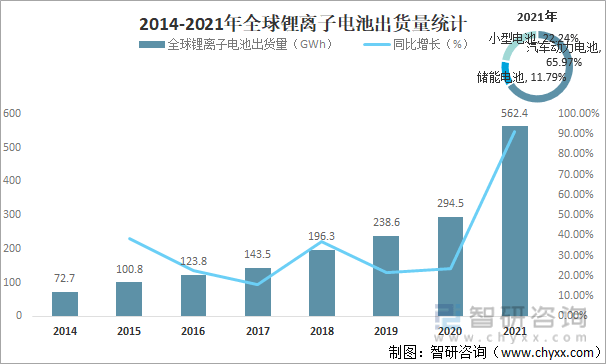 鋰電池作為新興的清潔能源,近年來發展十分迅猛,2021年全球鋰離子電池出貨量達562.4 GWh,較2020年增加了267.90 GWh,同比增長90.97%,其中,全球汽車動力電池出貨量為371.0GWh,同比增長134.7%;儲能電池出貨量66.3GWh,同比增長132.6%;小型電池出貨量125.1GWh,同比增長16.1%。