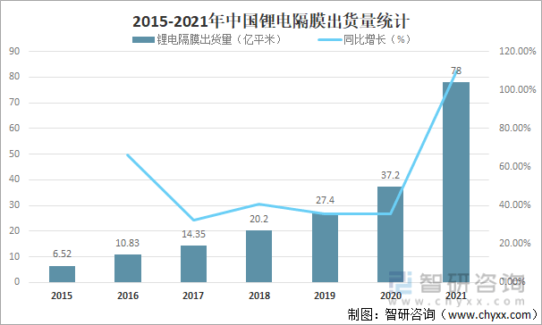 隨著鋰離子電池市場的蓬勃發展,作為鋰電池關鍵原材料之一的鋰電隔膜需求不斷擴大,2021年中國鋰電隔膜出貨量達78億平米,較2020年增加了40.80億平米,同比增長109.68%。