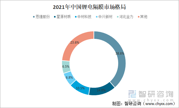 從企業格局來看,2021年恩捷股份占中國鋰電隔膜市場份額的38.6%;星源材質占中國鋰電隔膜市場份額的14.0%;中材科技占中國鋰電隔膜市場份額的10.5%;中興新材占中國鋰電隔膜市場份額的6.8%;河北金力占中國鋰電隔膜市場份額的6.5%。