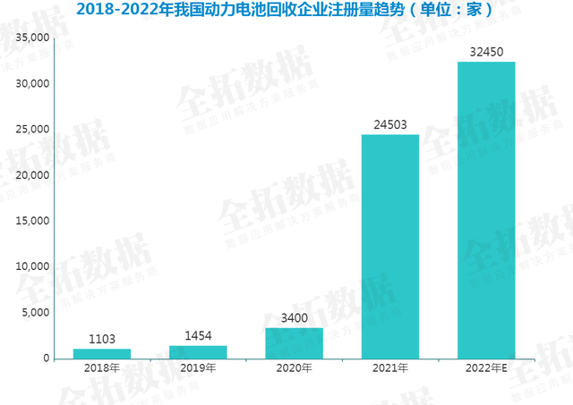 動(dòng)力電池回收產(chǎn)業(yè)發(fā)展迅速,使得市場(chǎng)上涌現(xiàn)了大量的動(dòng)力電池回收企業(yè)。據(jù)全拓?cái)?shù)據(jù)統(tǒng)計(jì),2018年動(dòng)力電池回收相關(guān)企業(yè)注冊(cè)量突破1000家,2020年新增動(dòng)力電池回收企業(yè)3400家,2021年動(dòng)力電池回收企業(yè)注冊(cè)量暴增至2.45萬家,預(yù)計(jì)2022年動(dòng)力電池回收企業(yè)注冊(cè)量將超3萬家。