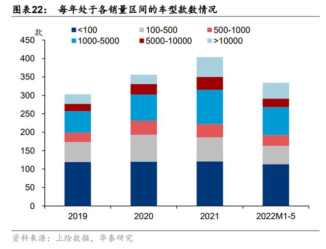 電池企業(yè)導(dǎo)入到放量是一個(gè)時(shí)間較長(zhǎng)且不確定性較高的過(guò)程。由于二線企業(yè)面對(duì)客戶較少, 訂單是放量的基礎(chǔ)。電池企業(yè)從導(dǎo)入到放量所需時(shí)間較長(zhǎng),通常需要 2 到 3 年的時(shí)間。當(dāng) 前車(chē)型銷(xiāo)量馬太效應(yīng)明顯,2019-2022 前 5 個(gè)月,產(chǎn)量在 500 輛以下的車(chē)型占比分別為 57.1%/54.2%/46.0%/48.8%,前十種爆款車(chē)型銷(xiāo)量占比合計(jì)分別達(dá)到 38.0%/44.3%/42.3% /38.5%,定點(diǎn)車(chē)型放量具有不確定性,阻礙了二線電池企業(yè)放量。