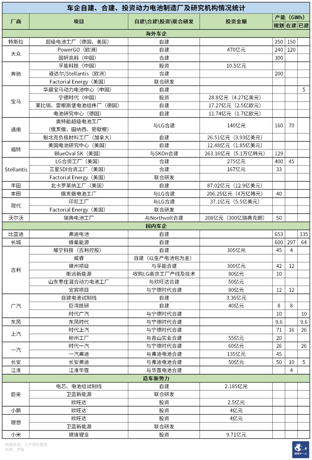 根據公開資料整理,車企對外公開宣布的自建及合資建設的動力電池的產能規劃已經超過3000GWh。這其中肯定有不少項目最終無法達到規劃產能,但即便只統計在建和已建產能,也超過1000GWh。