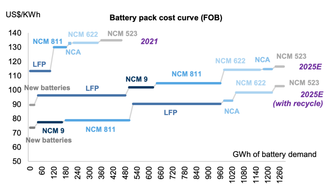 不同化學體系的成本曲線(2021、2025和2025考慮回收)