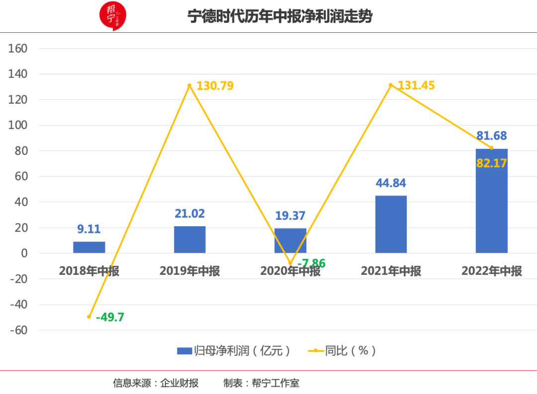 財報顯示,上半年,寧德時代營業收入1129.71億元,同比增長156.32%;歸母凈利潤81.68億元,同比增長82.17%。