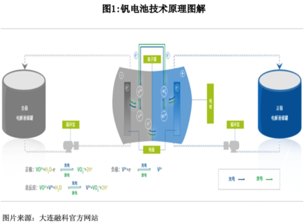 釩電池全稱是全釩氧化還原液流電池。其原理是利用釩氧化物與電極接觸發生電化學反應,使化學能轉換為電能。釩離子電解液含有化學能,釩電池儲能系統將其儲存在儲罐內,利用外接的泵,將電解液從儲罐壓入電池堆體內,使得電解液平行流過電極表面并發生電化學反應,從而完成釩電池儲能系統的充電或放電。