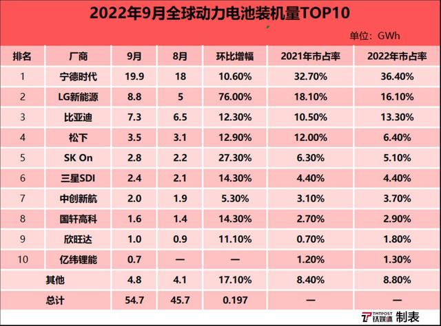 總體而言,今年9月仍然是中國車企領跑全球動力電池市場,但LG新能源市占率的大幅提升,使得中國企業的市占率均有所下降。