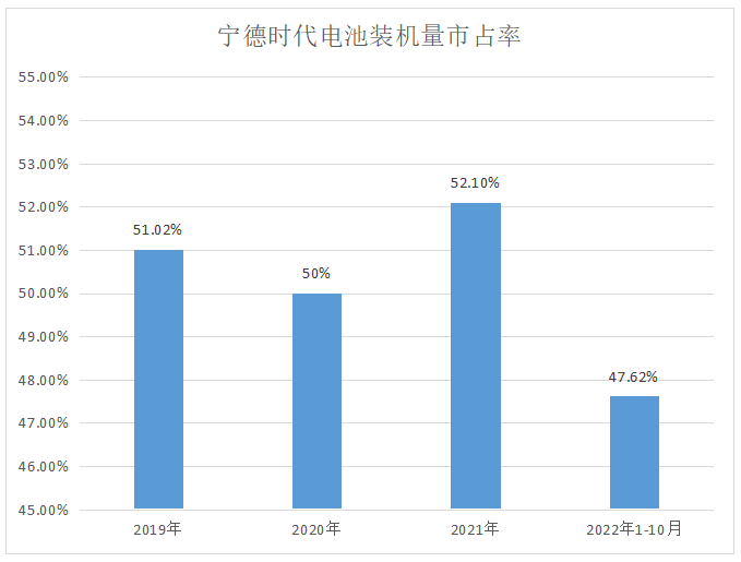 數據看似喜人,但仔細分析之后卻并非如此,要知道,在2019年-2021年,寧德時代的電池裝機量市占率均超過50%,但在2022年1-10月中,寧德時代的電池裝機量市占率只有47.62%,10個月中有8個月的市占率低于50%。