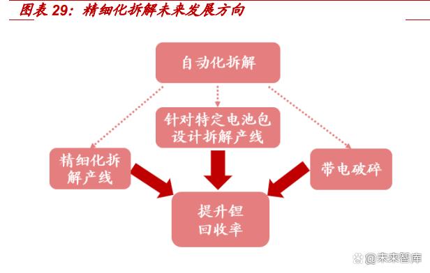 設備環節改進有望提升鋰回收率。如前文所述,從黑粉階段開始計算,目前行業鋰 平均回收率僅能做到 85%左右,鎳、鈷等金屬回收率在 95%以上,整體看鋰回收 率仍有提升空間。我國后道濕法冶金工藝較為成熟,提升空間不大。反觀,目前國 內多數的前道拆解、破碎環節較為粗糙。