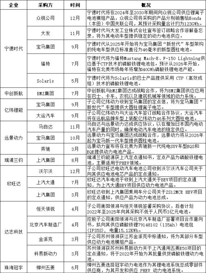 目前,大部分電池廠商對車企的供應制度為長期訂單模式,即與車企簽訂長期協議,長期供應。如去年9月,寧德時代與寶馬集團簽訂的一項長期協議中規定,從2025年開始,寧德時代將為寶馬集團“新世代”車型架構的純電車型供應圓柱電池;12月,寧德時代與本田達成協議,約定2024年到2030年,寧德時代為本田在中國的生產供應123GWh的純