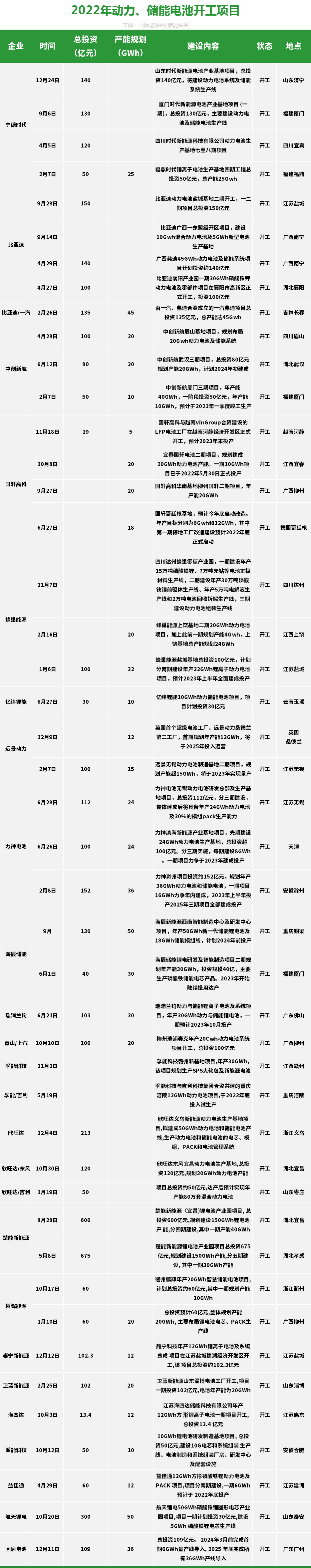 自2022年年初以來,各大電池廠商的動力電池、儲能電池產業基地項目紛紛開工,產能規劃總量數額巨大。值得注意的是,這一系列舉動與政策的引導不無關系。2022年1月,國家發展改革委、國家能源局印發了《“十四五”新型儲能發展實施方案》,方案提出,到2025年,新型儲能商業化初期步入規模化發展階段、具備大規模商業化應用條件。其中,電化學儲能技術性能進一步提升,系統成本降低30%以上。進一步釋放出了針對電池企業的積極信號,為動力電池廠商的擴產提供了不小的底氣。