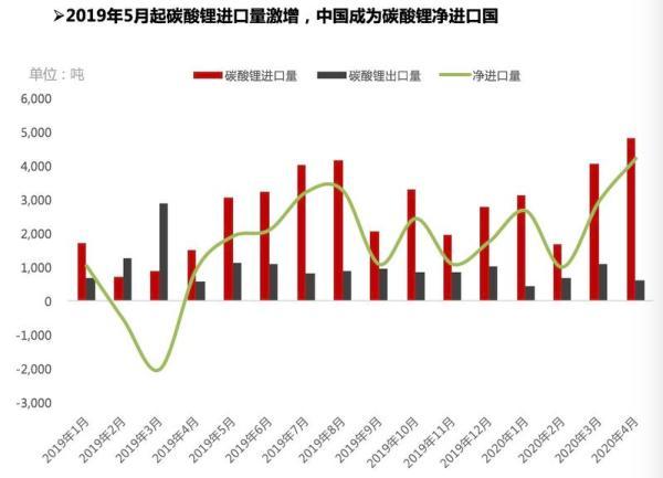 而我國成為碳酸鋰凈進口國是從2019年5月開始。當(dāng)時隨著國內(nèi)碳酸鋰價格快速下跌,海外碳酸鋰市場大量產(chǎn)品涌入中國市場;很多海外鹽湖企業(yè)也將碳酸鋰銷售重點放在中國市場。