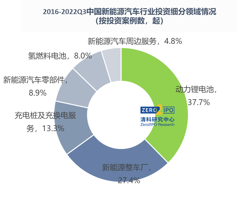 2016-2022Q3,我國新能源汽車行業投資主要集中于動力鋰電池、新能源整車廠、氫燃料電池、充換電服務等細分領域,其中動力鋰電池領域投資活躍度最高,投資案例數占比近40%,新能源整車廠投資規模最高,占比達52.8%。