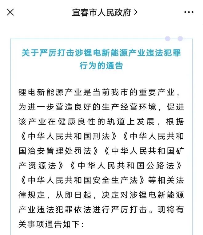 宜春市政府通告稱,鋰電新能源產業是當前宜春市的重要產業,從即日起,決定對涉鋰電新能源產業違法犯罪依法進行嚴厲打擊。