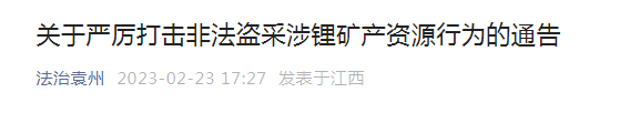 2月23日,江西省宜春市袁州區已發布《關于嚴厲打擊非法盜采涉鋰礦產資源行為的通告》顯示,為了及時發現、制止、嚴厲打擊私挖盜采礦產資源、破壞生態環境等違法犯罪行為,歡迎廣大人民群眾積極監督舉報,經查證屬實給予500至5000元獎勵,對舉報人信息將嚴格保密。