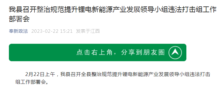 2月24日晚,江西宜春市人民政府官方微信公眾號發布通告,從即日起,決定對涉鋰電新能源產業違法犯罪依法進行嚴厲打擊。歡迎廣大干部群眾積極舉報涉鋰電新能源產業違法犯罪行為,相關線索經查證屬實后將給予一定獎勵,并對舉報人信息嚴格保密。
